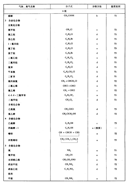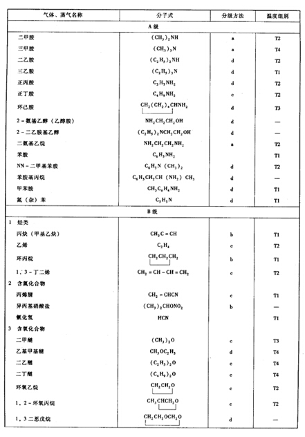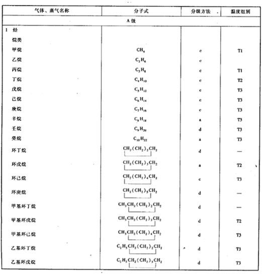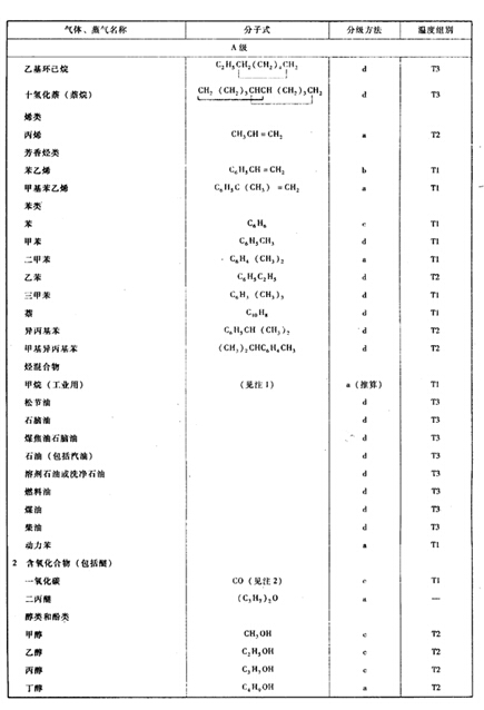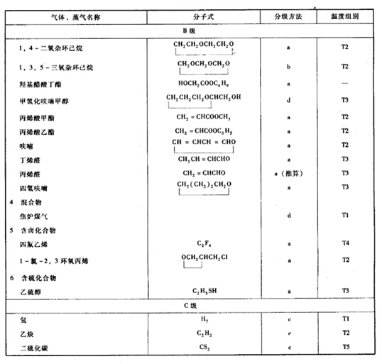 (標準的附錄) 檢驗程序1] 采用說明: 1]IEC60079-0中無此附錄。根據我國具體情況和檢驗工作的需要,按照GB3836.1(第1版)的有關規定提出。 A1 各單位按本標準及1.2防爆型式專用標準試制的電氣設備,均須送國家授權的質量監督檢驗部門按相應標準的規定進行檢驗。對已取得“防爆合格證”的產品,其他廠生產時,仍須重新履行檢驗程序。 A2 檢驗工作包括技術文件審查和樣機檢驗兩項內容。 A3 技術文件審查須送下列資料: a) 產品標準(或技術條件); b) 與防爆性能有關的產品圖樣(須簽字完整,并裝訂成冊)。 以上資料各一式二份,審查合格后由檢驗部門蓋章,一份存檢驗部門,一份存送檢單位。 c) 按23.2規定檢驗單位認為確保電氣設備安全性必要的其他資料。 A4 樣機檢驗須送下列樣機及資料: a) 提供符合合格圖樣的完整樣機,其數量應滿足試驗的需要。檢驗部門認為必要時,有權留存樣機; b) 產品使用維護說明書一式二份,審查合格后由檢驗部門蓋章,一份存檢驗部門,一份存送檢單位; c) 提供檢驗需要的零、部件和必要的拆卸工具; d) 有關試驗報告: 以上試驗報告和記錄各一份。 e) 有關的工廠產品質量保證文件資料。 A5 樣機檢驗合格后,由檢驗部門發給“防爆合格證”,有效期為五年。 A6 取得“防爆合格證”后的產品,當進行局部更改且涉及相應標準的有關規定時,須將更改的技術文件和有關說明一式二份送原檢驗部門重新檢驗,若更改內容不涉及相應標準的有關規定時,應將更改的技術文件和說明送原檢驗部門備案。 A7 采用新結構、新材料、新技術制造的電氣設備,經檢驗合格后,發給“工業試驗許可證”。取得“工業試驗許可證”的產品,須經工業試驗(按規定的時間、地點和臺數進行)。由原檢驗部門根據所提供的工業試驗報告、本標準和專用標準的有關規定,發給“防爆合格證”后,方可投入生產。 A8 對于既適用于Ⅰ類又適用于Ⅱ類的電氣設備,須分別按Ⅰ類和Ⅱ類要求檢驗合格,取得防爆合格證。 A9 檢驗部門有權對已發給“防爆合格證”的產品進行復查,如發現與原檢驗的產品質量不符且影響防爆性能時,應向制造單位提出意見,必要時撤銷原發的“防爆合格證”。 注:檢驗部門在”防爆合格證“有效期內至少應對獲證產品進行一次復查,包括對制造單位產品質量保證條件核查。 附錄B (提示的附錄) 氣體和蒸氣按其最大試驗安全間隙(MESG) 和最小點燃電流(MIC)分級1] 采用說明: 1]IEC60079-0中該附錄為附錄A。 對”隔爆型“電氣設備而言,氣體和蒸氣的分級是以最大試驗安全間隙(MESG)為基礎,在一個間隙長度為25mm的試驗容器內完成的,測定MESG的標準方法是用IEC79-1A文件規定的試驗容器;關于只有一個容積為8升的球形容器內,在間隙附近點火進行測定的方法,只有當有新規定的才予以修改。 極限值為: A級 MESG大于0.9mm; B級 MESG0.5mm~0.9mm; C級 MIESG小于0.5mm。 對于本質安全型電氣設備,氣體和蒸氣的分級是以它們的最小點燃電流(MIC)與實驗室用甲烷的最小點燃電流之比為基礎確定的。測定MIC比值的標準方法,必須是采用IEC79-3規定的“本質安全電路的火花試驗裝置”,要用其他儀器測定,只有當有新的規定時才予以變更。 極限值為: A級 MIC比值大于0.8; B級 MIC比值0.45~0.8; C級 MIC比值小于0.45。 大多數氣體和蒸氣,在兩種測定中只進行一種即可列入合適的級別,下列情況下只需進行一種測定就可以。 A級 MESG大于0.9mm或MIC比值大于0.9; B級 MESG在0.55~0.9mm之間或MIC比值在0.5~0.8之間; C級 MESG小于0.5mm或MIC比值小于0.45。 在下列情況下既要測定MESG,也要測定MIC比值。 1) 在只測定MIC比值時,其值在0.8~0.9之間。要做出分級,就有必要再測定MESG。 2) 當只測定MIC比值時,其值在0.45~0.5之間,要做出分級,就有必要再測定MESG。 3) 當測定MESG時,其值在0.5mm~0..55mm之間。要做出分級,就有必要再測定MIC比值。 同一系列的物質中某一氣體或蒸氣,可以從這系列分子量較小的另一物質的測定結果中,初步推算出這種氣體或蒸氣屬于那一級。 下面表格中的氣體和蒸氣就是根據這個基本規則編制的。 各種氣體或蒸氣附帶的字母意義如下: a) MESG值分級; b) MIC比值分級; c) 既測定MESG,也測定MIC比值; d) 化學結構相似性分級(初步分級)。 注 1 按體積計,含15%及以下氫氣的所有甲烷混合物都應列入“工業用甲烷”。 2 為了使一氧化碳和空氣混合物在標準環境溫度下達到飽和,一氧化碳可以含有足夠的濕度。 未列入表中的氣體可按照MIC和MESG分類,但須注意其特殊性能(例如按照MIC和MESG列入ⅡC類,但它的爆炸壓力超過氫氣和甲烷,應列在ⅡC之外)。 3 表中列出了溫度組別的參考資料1] 采用說明: 1]為便于設計、制造和檢驗,本標準在表中增加相應氣體的溫度組別。 表B