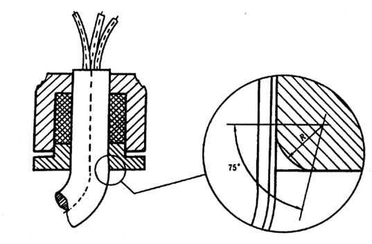 1-密封圈;2-引入裝置;3-壓緊元件;4-電纜;5-填料; 6-密封墊;7-壓緊填料元件 圖D1 電纜引入裝置 ――彈性密封圈; ――金屬或復合密封圈; ――填料。 電纜密封圈由單一材料或復合材料制成,其形狀適合所用電纜。 注 1 對密封圈選材時,注意6.1的要求; 2 外殼的防爆型式也取決于電纜內部結構。 D2.2材料 D2.2.1 7.3關于材料靜電電荷的要求適用于電纜引入裝置的外露件。 D2.2.2 彈性密封圈材料應符合D3.3型式試驗中的老化試驗。 D2.2.3 填料材料應符合第12章規定的粘接材料的規定。 D2.3 夾緊 D2.3.1電纜引入裝置應能夾緊電纜,防止電纜從引入裝置中被拔脫或扭轉,這種夾緊作用可通過夾緊裝置、密封圈或填料來實現。任何一種夾緊措施均應符合D3有關的型式試驗要求。對非鎧裝電纜,可通過密封圈或填料來實現。 D2.3.2 Ⅱ類無夾緊裝置的電纜引入裝置,如果將D3規定降低到25%進行夾緊試驗合格,并且文件規定該裝置僅用在Ⅱ類固定安裝場所,并且用戶保證夾緊電纜,則認為該裝置亦可接受。這種裝置應加標記“×”。 D2.4 電纜引入 D2.4.1電纜引入裝置不應有尖銳棱角,以防損傷電纜。 D2.4.2 可彎曲電纜進線口應有一個至少為75°的圓弧,半徑至少為允許使用電纜最大直徑的四分之一,但不必超過3mm(見圖D2)。