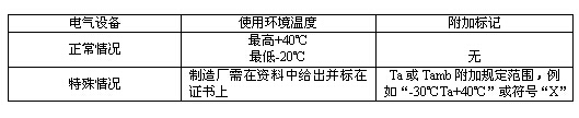 電氣設備應設計在環境溫度為-20℃~+40℃下使用,在此時不需附加標志。 若環境溫度超出上述范圍應視為特殊情況,制造廠應將環境溫度范圍在資料中給出,并在銘牌上標出符號Ta或Tamb和特殊環境溫度范圍;或按27.2中9)規定在防爆合格證編號后加符號“X”(見表2)。 表2 使用環境溫度和附加標記